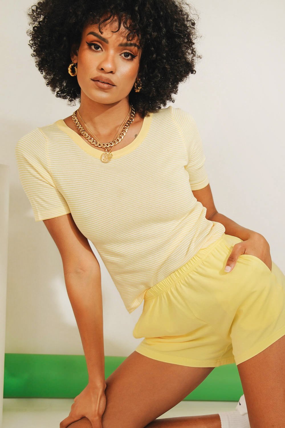 Back To Basics... For that effortless cool weekend vibe, we're pairing this soft, stretch knit top with vintage denim & tie up with mules! Also available in Green.