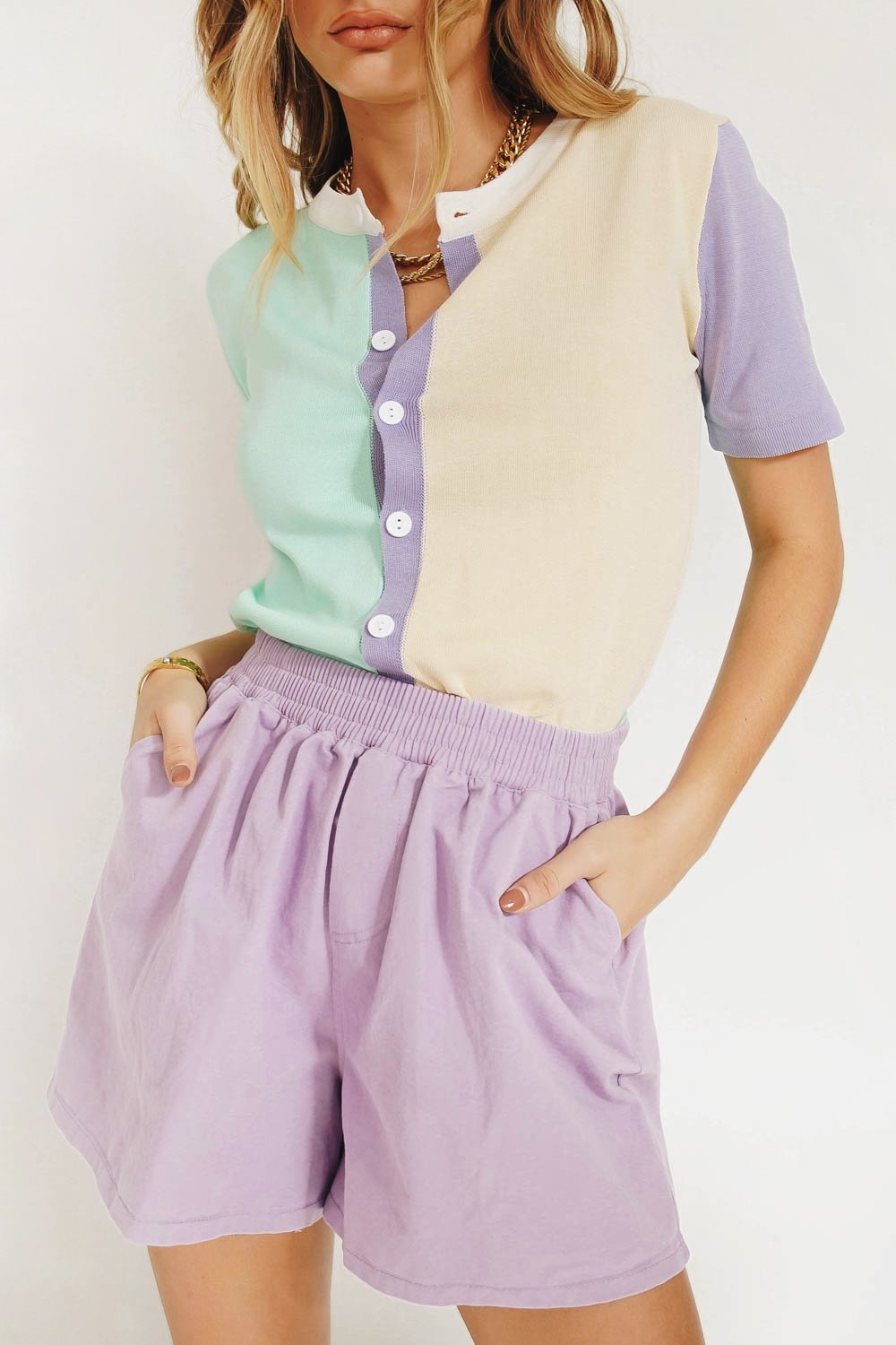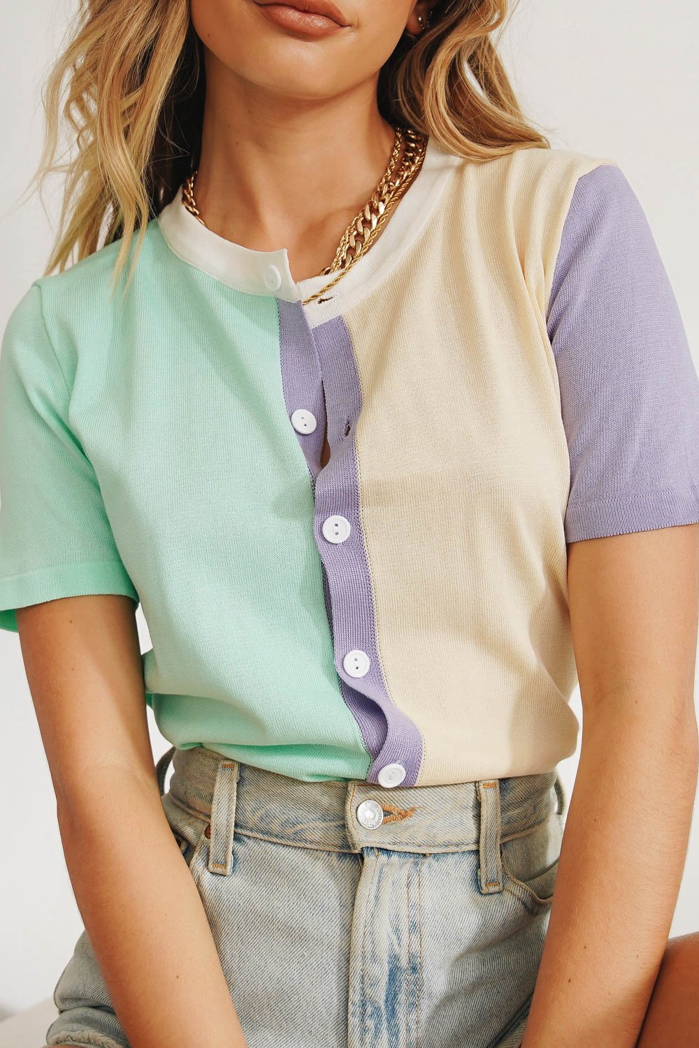 Pastel Love. Made from a soft stretch knit fabric & featuring centre front buttons, our Flashback Button Front Knit Top is the perfect addition to your weekend wardrobe. We're styling this number with vintage shorts & sneakers!