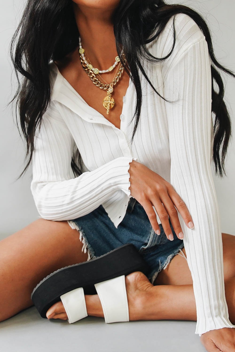 Effortless & Chic. Featuring centre front buttons, this ribbed knit top is giving us a total 90's dreamgirl vibes. Such an easy wear, it's the perfect go-to for a weekend spent with the girls! Also available in Lime.