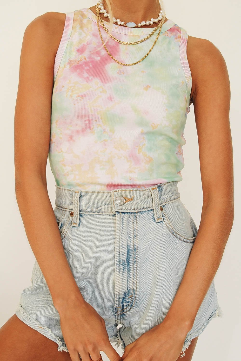 Under The California Sun... This tie dye number is the ultimate addition to your vacay wardrobe. For a total cool girl 90's vibe, style with vintage denim shorts & mules! You'll be obsessed!