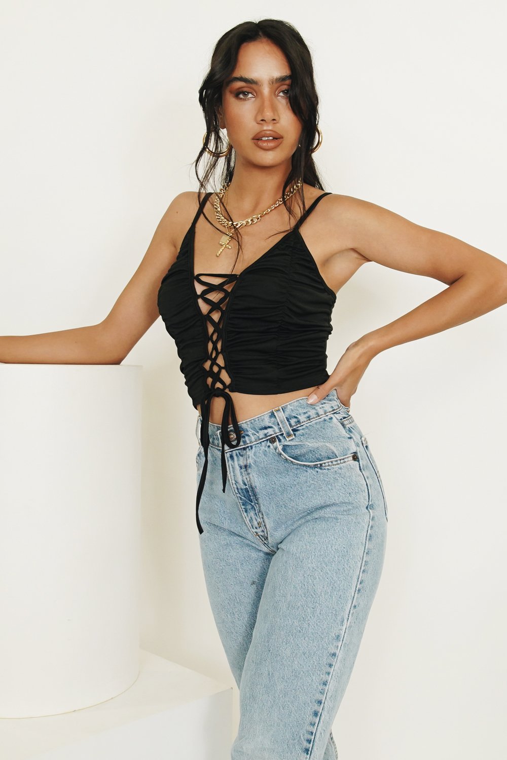 For a night spent dancing & sipping cocktails with the girls... Featuring a lace up tie front & elastic ruched detailing, our After Dark Top is so cool when styled with vintage denim & tie up mules!