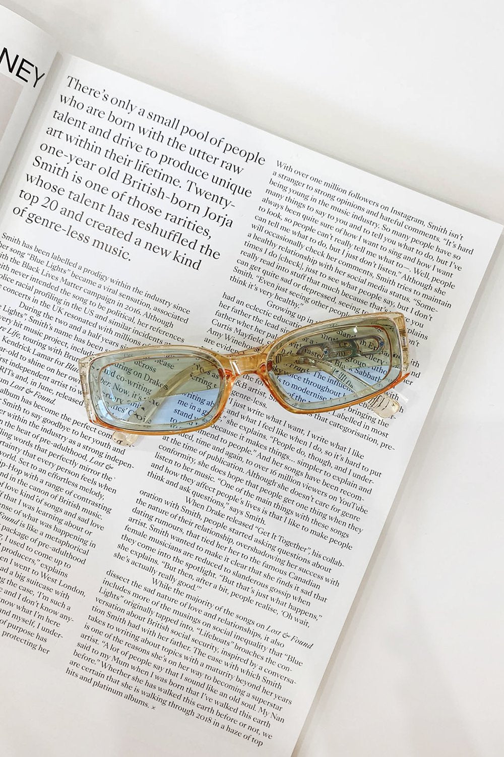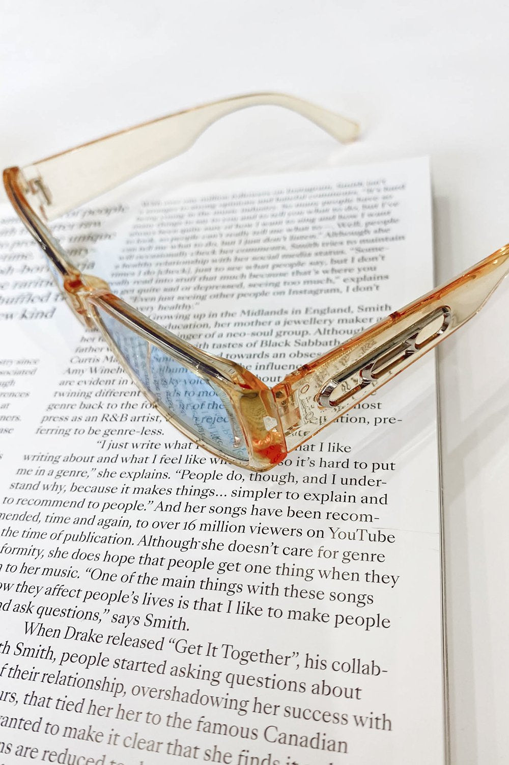- Featuring yellow tint frames, blue tint lenses and a side cut out detail