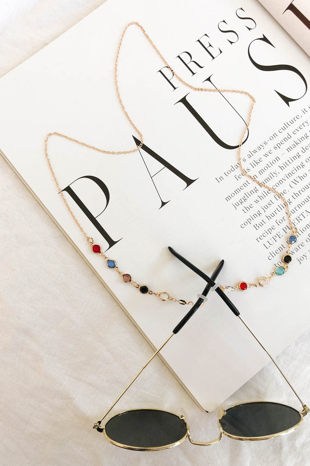 Cool & Chic. This gold & gem detailed sunglasses chain looks so cool paired with your fave sunnies for a layered look. Please note sunglasses are not included.