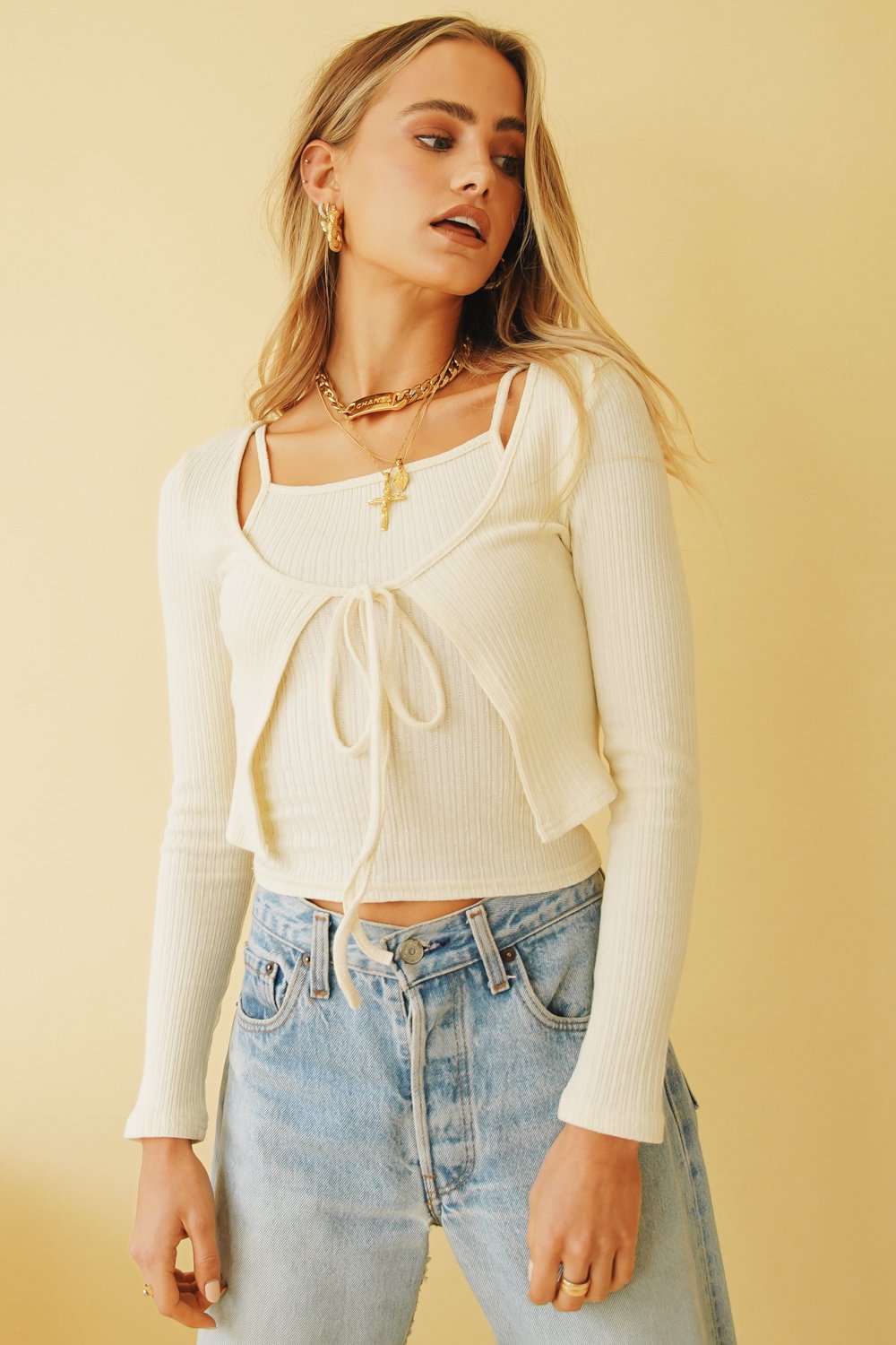 The ultimate chic street style look! Our Inner Supermodel Cardi Set is made from a soft ribbed fabric & includes both a cami & tie front cardigan - Wear them together or separately, paired with vintage denim for a look we love!